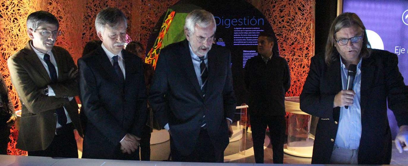 Pie de foto: La exhibición, que es resultado de la colaboración con el Museo Americano de Historia Natural de Nueva York, revela la gran diversidad de bacterias, virus y otros seres diminutos que viven en nuestro cuerpo. En la imagen, el rector de la UNAM (tercero de izquierda a derecha) atiende las explicaciones de uno de los curadores de la muestra, lo acompañan los doctores William Lee y César Domínguez. Imagen:Anayansin Inzunza.
